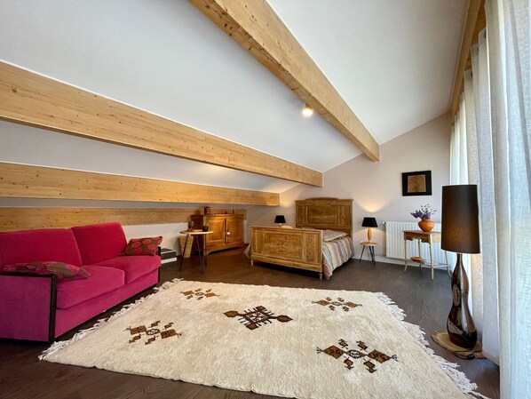 On the mezzanine, you'll find a reading/relaxation area. A magnificent wooden staircase leads to the two single beds (90x190cm) hidden behind a screen.