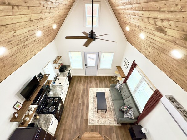 This tiny cabin is a two bedroom and 1 bath. Downstairs you have a spacious living room and kitchen that includes everything you would need for a comfy stay. Couch does fold out to sleep one adult. There is a bar table to eat or do your computer work at. The kitchen has a refrigerator, stove, microwave, drip style coffee maker and all the essentials needed to eat, cook and drink. The downstairs bedroom includes a queen-size bed and cubical dresser. The upstairs bedroom is accessed by climbing the rustic ladder where you'll find two full-size beds. The bathroom is downstairs and is very roomy. It has a walk-in shower, toilet and vanity. The bathroom does come with a set of toiletries for your trip which includes; shampoo, conditioner, body wash, and lotion.