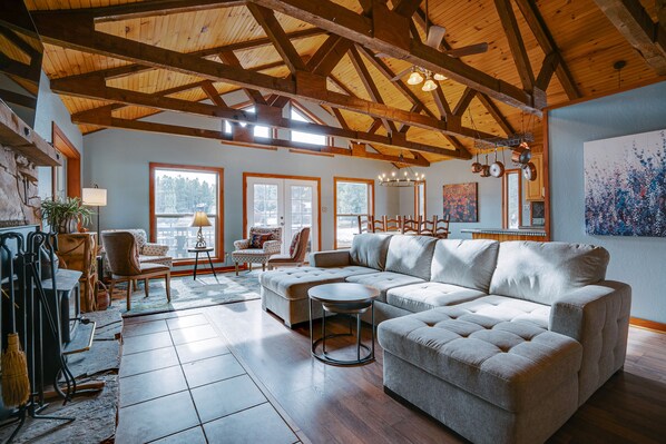 On the first floor, the living and dining areas are combined into an open-plan area. The living area features a wood-burning stove, a smart TV, and a sofa with dual chaise lounges that seats four. There is also a sitting area for four that looks out onto a sweeping view of the Cougar trail and has access to a deck which is perfect for wildlife viewing. The dining area seats seven and opens into the kitchen, which is equipped with full-size appliances, including a dishwasher. From the kitchen, there is access to the fenced back yard and covered back porch.