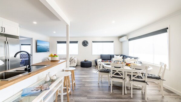The open plan living/ dining area has comfortable, stylish furnishings and even has a lounge designated for the beloved fur babies. There is a split system air conditioner that provides cooling through the entire property, free unlimited Wi-Fi, and Smart TV’s. The second sitting area also has a wall mounted Smart TV and single daybed and trundle; this room can be used as the fourth bedroom as well. The property has a beautifully designed kitchen with stunning timber benchtops, induction cooktop, wall oven, air fryer, microwave, coffee machine, dishwasher, and family size fridge/ freezer.