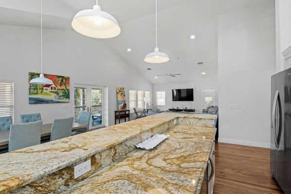 The primary bedroom will change your clocks to island time with its tropical décor doors opening onto the patio. The primary ensuite bathroom has a double vanity and a stand-alone tub. The second bedroom will surely make your guests smile and has access to the deck. The third bedroom is ideal for younger or single travelers, with a tv and plenty of storage space for vacation necessities. The second bathroom has a shower and tub combination and two sinks, making getting ready in the morning blissful.