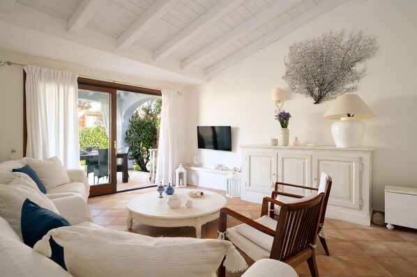 Leucia Cervo is a holiday villa in Costa Smeralda featuring carefully designed interiors. Approximately 80 sqm in size, it offers bright spaces tastefully furnished, where white interiors and light tones enhance the natural light and Mediterranean atmosphere. The living area opens onto the garden, creating a relaxing setting with pleasant green views. The villa includes two bedrooms, one of which with an en-suite bathroom, a fully equipped independent kitchen, and well-maintained outdoor spaces, including a furnished terrace and a private garden, perfect for enjoying moments of relaxation outdoors.