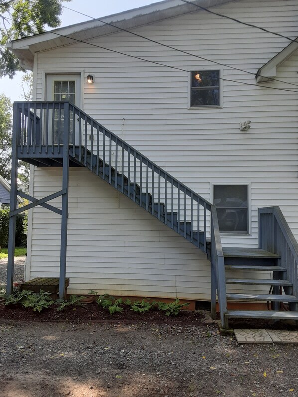 This apartment is on the second floor, and there is a flight of exterior stairs leading up to the front door.