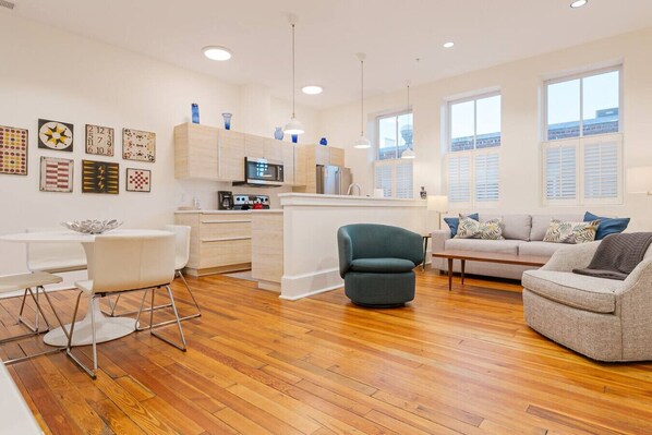 Dog-friendly King BD + Pull-out sofa in the Epicenter + Private Outdoor Balcony