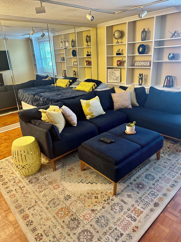 This 4th floor condo is the obvious choice for your Atlanta vacation or business trip and comfortably sleeps 4 guests in one bedroom with a sectional sofa that can be used as a bed. and an air mattress available upon request for additional friends and family. The bedroom is spacious with two double beds and a laptop-friendly workspace. The bathroom is modern with modern fixtures.