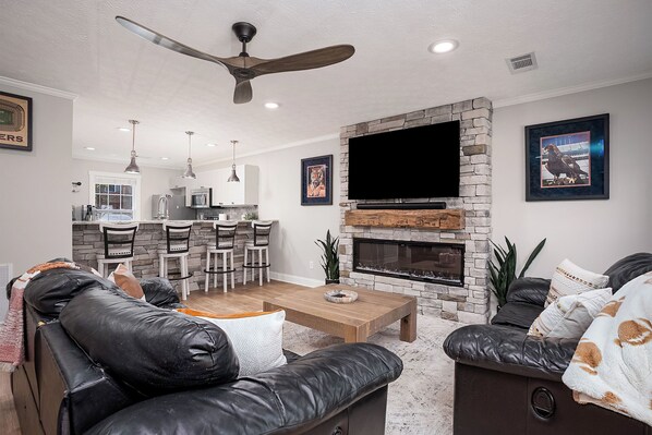 Continue down the hall into the spacious living area, recently remodeled with an electric fireplace with custom stonework, large smart TV, and built-in speaker system. The space offers plenty of seating with two sofas and flows seamlessly into the dining area with seating for four. Just off the living room, step outside to your private patio featuring a dining table and brand new gas grill, perfect for relaxing or entertaining.