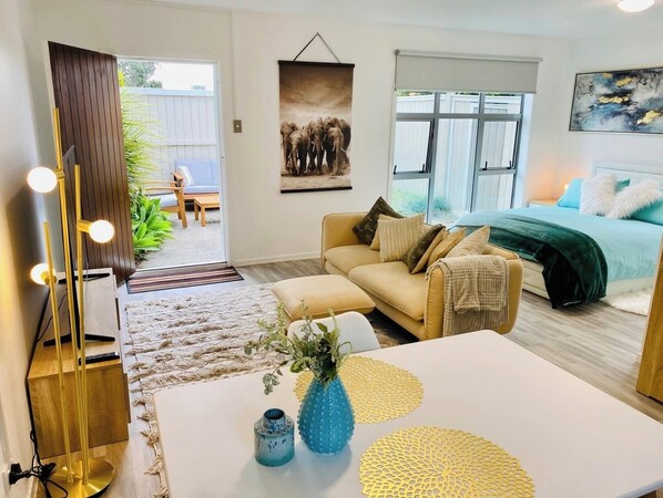 Takapuna Beachside Guest House offers a peaceful retreat just steps from the beach and local shops. Relax in your own gated courtyard, unwind with outdoor furniture, or stroll to nearby amenities like restaurants and supermarkets. With essential kitchen facilities, smart TV, security lights and ventilation systems you can enjoy the comforts of home.