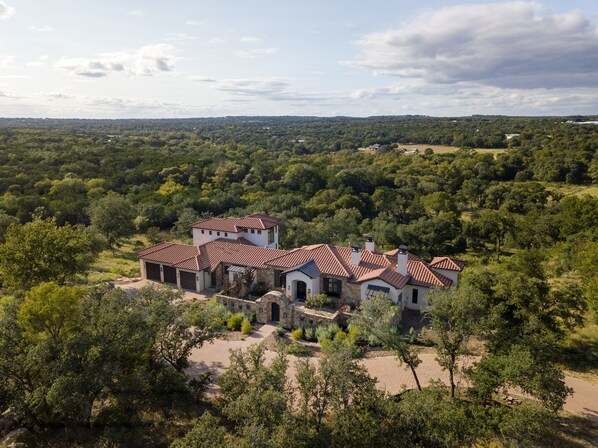 The house is 6000 square feet overlooking the Barton Creek Valley surrounded by 33 acres of wooded areas and pasture. It can sleep up to 16 people. It has 5 bedrooms plus a theater that can be converted into sleeping area.