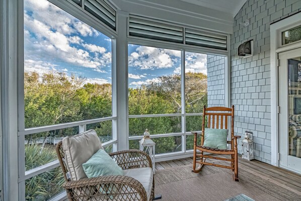 Upstairs, the Queen Primary suite boasts not only a walk-in California closet and ensuite with a tub/shower but also accesses one of the home's top-level screened porches - the ideal spot for a quiet read enjoying briny breezes. Beyond, this level's living space's open floor plan is crowned by a high, vaulted, beamed ceiling and soaked in natural light from its surrounding windows. The comfortable conversation area is anchored by a gas fireplace and tenders naturescapes on all sides plus egress to both second-story screened porches. Nearby the generous dining space is furnished with a stylish dining set. Savor meals and outdoor views from here or by dining alfresco on the home's dining deck-situated between the main house and the crofter. The chef's kitchen delights with stainless appliances, granite counters, a double sink, breakfast bar, a designer backsplash and attractive custom cabinets. This floor also houses the laundry.