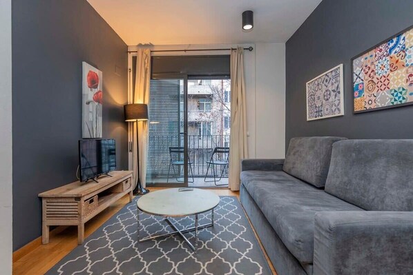 This apartment has a comfortable living room with a dining table, opened to a bright balcony, ideal for sunny days in Barcelona!