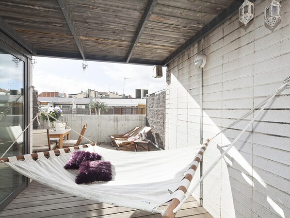 Outdoor dining - Penthouse near the hospital clinic with terrace, 3 bedrooms for 6 (Barcelona)