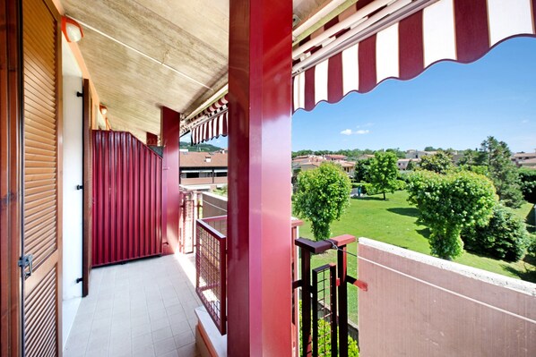 The holiday apartment boasts a private outdoor area with a covered terrace and a balcony.