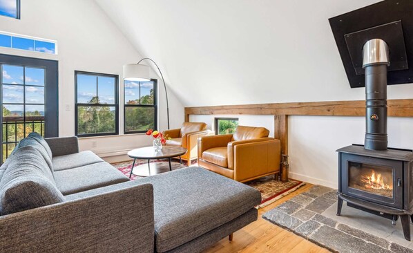 At the back of the house lies an inviting sitting room, complete with cozy furnishings and access to a large stone patio overlooking the verdant garden and valley beyond. This is the perfect space to unwind, relax, and take in the breathtaking views of the surrounding landscape. Head upstairs for even more entertainment and relaxation, with a plush King-size bed awaiting you in the primary bedroom. The open-concept space on this level includes a charming living room to your right, with a central woodstove surrounded by plush furnishings. Separating the living space from the gourmet kitchen is the spacious dining area, where a stunning natural wood table seats up to eight guests. The views of the valley from the dining area are spectacular.