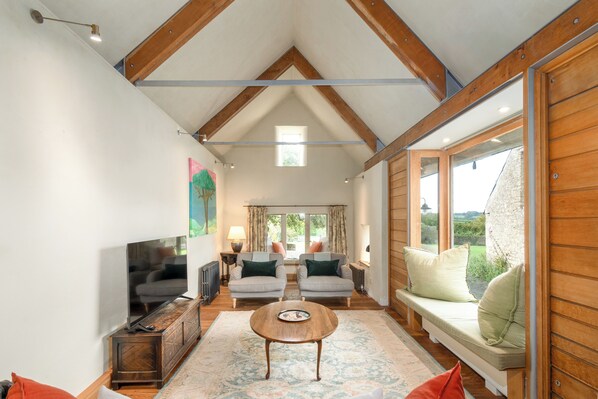 There are two sitting rooms at The Malthouse, but we like to refer to the other as ‘The Garden Room‘. Through the kitchen and into the sitting room, you will be welcomed by an inglenook fireplace, which is very welcoming on those colder evenings. Enjoy gazing into the flames on the deep sofa, with cosy lighting. You will find the room is comfortable and thoughtfully furnished with large cushions and throws. Additionally, we have added a table if you need to work from home. We do supply some wood for the fire, however, we would suggest ordering more through us before you arrive.