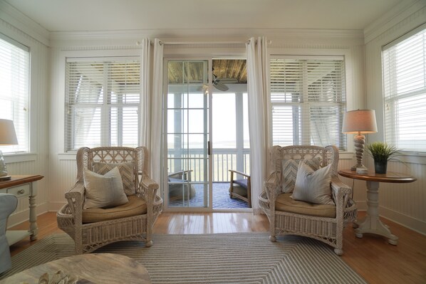 Recently redecorated and remodeled 3 bedroom, 3 bathroom home with the best MILLION DOLLAR sunset views on the island! This beach home has everything you will need for a great time at the beach. All 3 bedrooms have smart TVs as well as a large smart TV in the living room, kitchen table seating for 8, a grill and amazing views on every level! Swing in the hammock and enjoy a book from the house collection. The beach is an easy walk or a 2 minute golf cart ride.