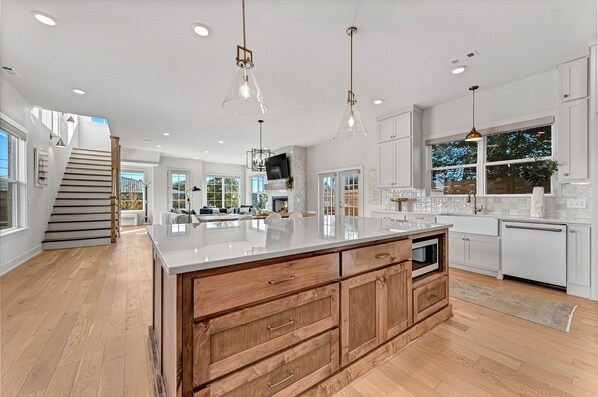 Past the living area you continue into an oversized chef’s kitchen stocked with everything you need to make a delicious meal. You will enjoy sitting around the large dining table with the family or scooting up to the large quartz island for a wine tasting. Open the kitchen drawers and doors for all of your cooking and dining needs. The extra large pantry holds smaller appliances such as the crock pot, air fryer, expresso machine, coffee maker with a sample of local roasted beans, blender and so much more.