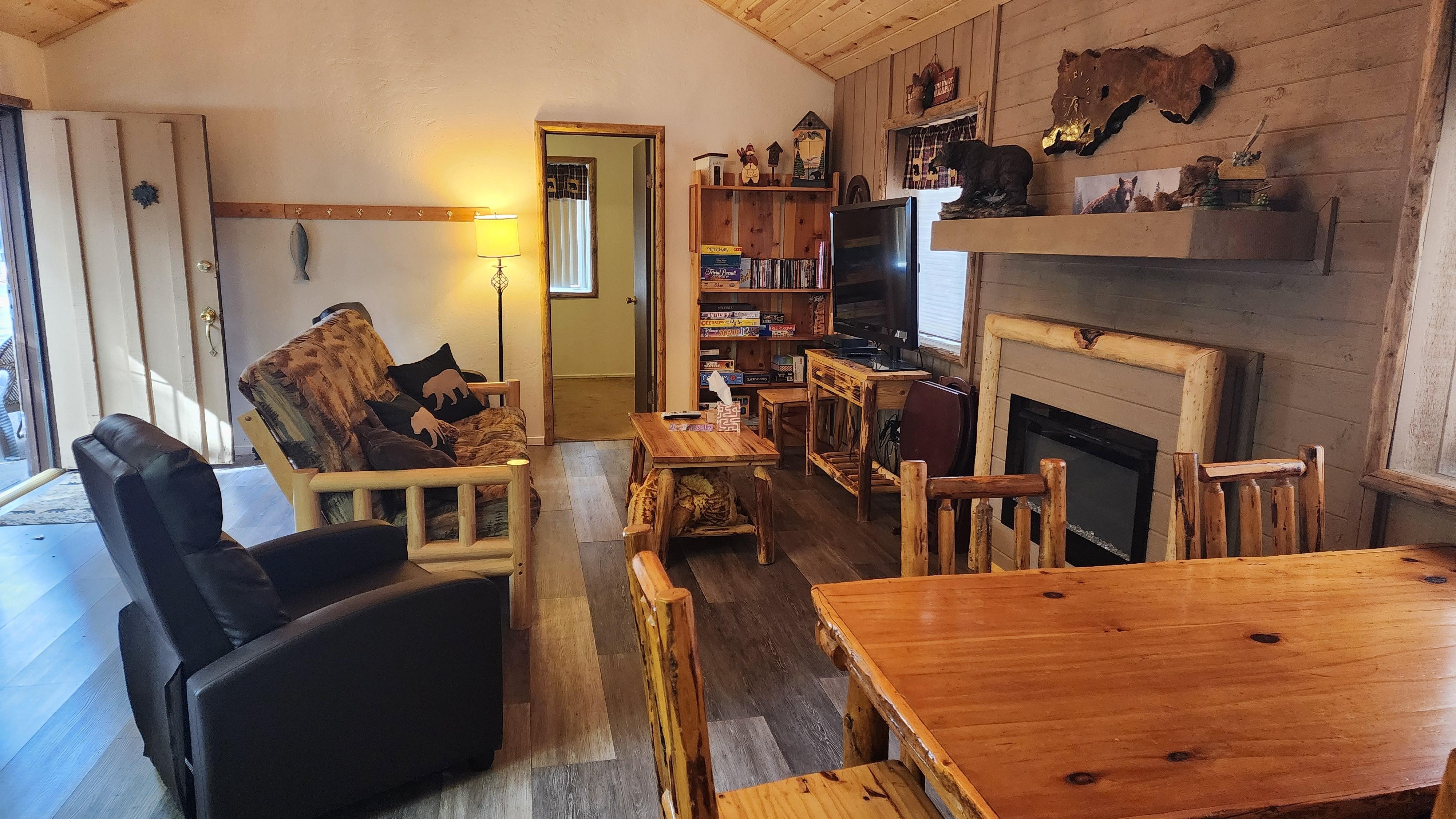 This 2 Bedroom 1 Bathroom Cozy Cabin has an open common area that includes a living room with two recliner chairs to sit in, Cable TV, WiFi, and a kitchen area with all the amenities included (please bring your own paper type items with you), a coffee maker (Please bring your own coffee and filters) and an Electric Fireplace to warm you up. The master bedroom (Back Bedroom of Cabin) has a Queen Size bed, and the guest bedroom (Front of Cabin) also has a Queen Size bed, along with a Full Size Futon in the Living Room to sleep on (Please bring your own pillows, blankets and linens). The Cozy Cabin can sleep up to (6 people). The Backyard has a BBQ with a picnic table ans some chairs to use. The bathroom is a Shower/Bath with a Sink and Toilet (please bring your own paper type items and shower items with you).