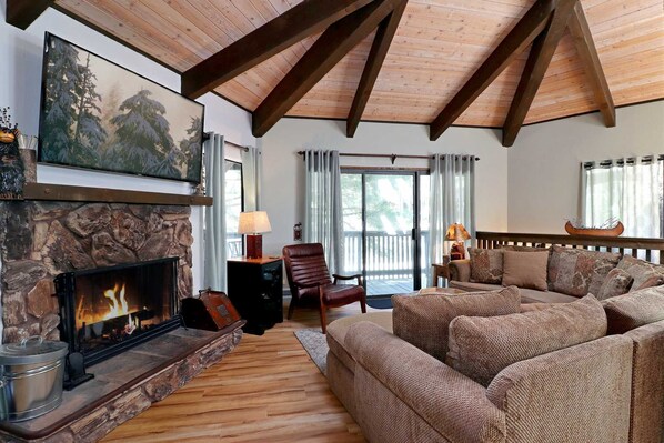 ā Upper Level: The main living area showcases stunning wood flooring and a hexagonal design with skylights, creating a natural connection to the surrounding trees. Relax on the large wraparound sofa in front of the wood-burning fireplace and flat-screen TV with cable, or step onto the front deck for serene outdoor views.