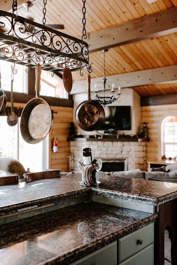 Gorgeous handcrafted log and stone luxury cabin, sleeps 16 (max 10 adults). You'll really love this "one of a kind" cabin. The owners have spared nothing in making this one of the most luxurious cabins up here. This professionally decorated log cabin blends indigenous mountain materials with the artisan's finely crafted workmanship. The result is a strikingly beautiful combination of a mountain log home and a European stone castle.