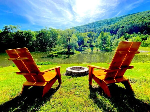 This authentic log cabin is part of `Valleywood Acres Inn and Cottages`, and sports a sprawling 18 acres of nature, walking trails, private lake and Esopus creek to explore, fish, heal your soul by the fire pits or just kick-back and relax on the covered porch