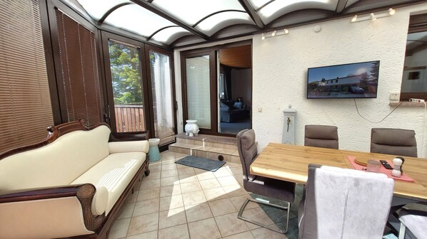 großzügig und komfortabel eingerichtete Wohnung mit gemütlichem Wohnbereich und Wintergarten sowie sehr schönem Garten mit Morgen- und Abendsonne