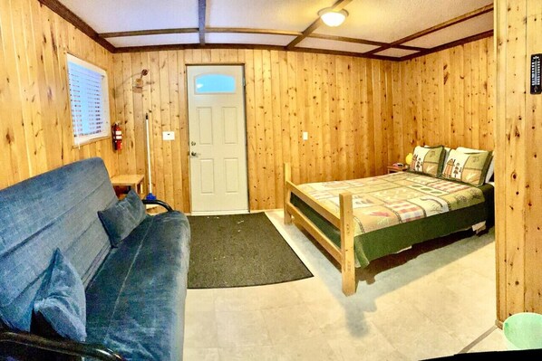 This cabin features a queen size bed, a sofabed, a full bathroom, and a kitchen with a two burner cooking top.