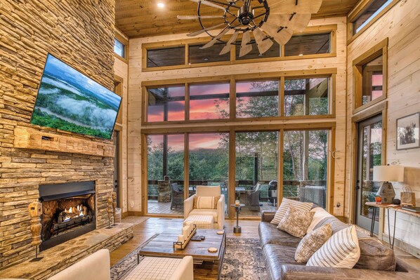 -Main level living room - sofa, two chairs with Ottomans, coffee table, side table, gas fireplace, 65" smart TV