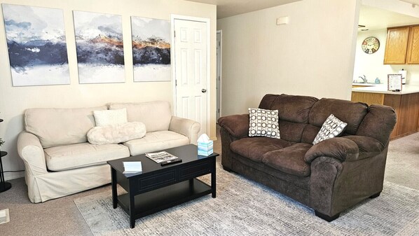 Relax in the spacious living room on the extra-large couch, which converts into a comfy full-sized bed. Perfect for families or friends, this pet-friendly home has a fully fenced yard where your furry companions can roam freely. The two bedrooms are designed with comfort in mind, each offering a peaceful space to unwind after a day of fun.