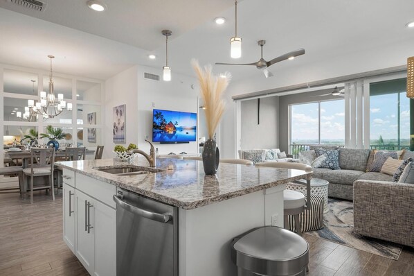 The kitchen is fully stocked and features stainless steel appliances such as a french door refrigerator, double oven, microwave and a large granite counter-top island with height adjustable chairs. The dining table can seat up to 6 people.