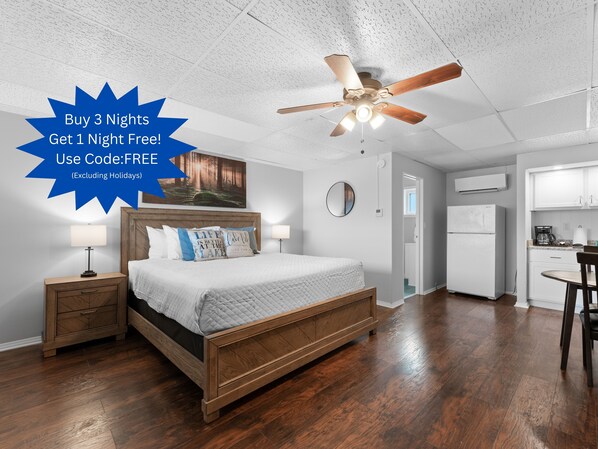 Escape to comfort and convenience at our cozy pet friendly studio, perfect for couples, families, or solo travelers! This room features a king size bed with soft bedding, and a streaming only flat screen tv.