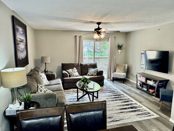 Each bedroom comes with a smart TV to use with your favorite subscriptions. The condo also has an air mattress allowing you to sleep up to 8 guests total and also has a large 55" smart TV with comfortable seating in the Living Room. We also provide a port-a crib for those with a little one. The sliding glass doors lead out onto the back deck which is a nice spot for relaxing backed up with a natural rock wall typical of Missouri. The condo includes high speed 1 gig Wi-Fi which is great for remote work, home schooling, & vacation needs. You will have access to the community outdoor pool. (The pool is open from Memorial Day Weekend until Labor Day weekend and is closed the rest of the year).