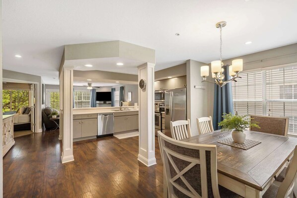 After a long day of exploring the surrounding area, unwind in the living room with ample sofa seating options. A screened-in balcony with access from both the living room and master bedroom offers a space to enjoy morning coffee or quiet relaxation with tranquil views of the surrounding property. It will truly feel like your home away from home.