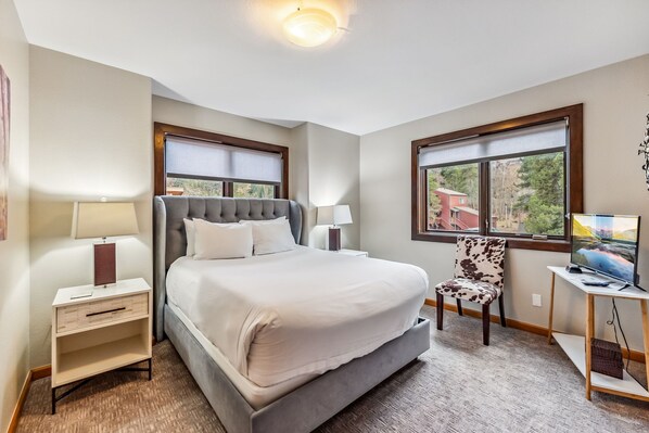 The upstairs space offers two master bedrooms with one queen as well as a king and full private bathrooms attached. Each bed has a 3” gel topper to the mattresses for the most comfortable nights sleep! Get a good night's rest after a day exploring the downtown Breck area or going out and experiencing the outdoor recreation available in hiking and mountain biking!