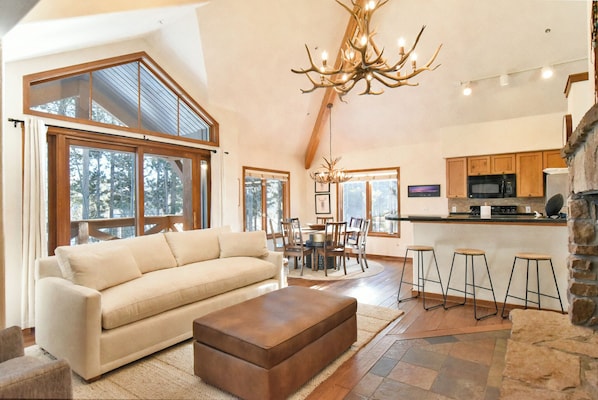Inside, the condo offers a warm and rustic atmosphere with an open-concept living area featuring comfortable seating, a large gas fireplace, and vaulted ceilings that make the space feel bright and welcoming. The fully equipped kitchen has everything needed for cooking meals at home, with both a breakfast bar and dining table providing plenty of seating for your group. A small patio off the living room lets you take in the crisp mountain air after a day of exploring.