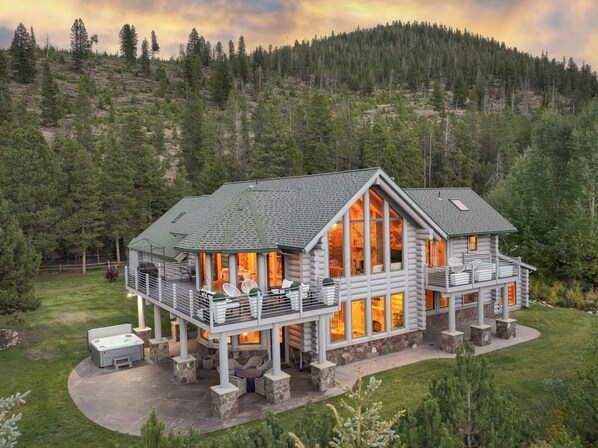 Step inside to soaring cathedral log ceilings, four cozy gas fireplaces, spacious living areas, a gourmet kitchen, and two wet bars perfect for entertaining. Outside, unwind on multiple balconies, gather around the fire pit (seasonal), or relax in the private hot tub while soaking in the mountain scenery. With four beautifully appointed bedrooms — including a private-entry studio suite and a luxurious master with walk-in shower and soaking tub — there’s space for everyone to relax in comfort.