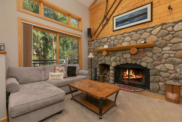 The living area has vaulted ceilings and great natural light for an open, airy feel. There’s plenty of seating, as well as a river-rock wood fireplace and a huge flat-screen TV with surround sound – it’s an ideal spot for relaxing and catching a movie (or the morning snow report). And just outside on the deck, there’s your own private hot tub! You’ll enjoy seasonal access to the nearby Upper Village heated swimming pool and hot tubs.