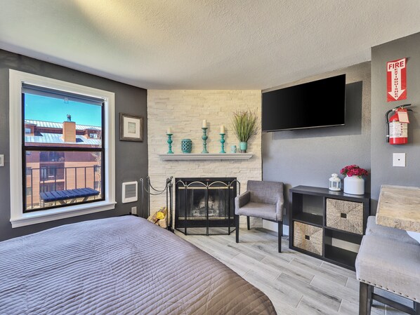In this beautiful, modern studio across from the clubhouse and Apple Annie's general store, you'll find a light and airy single-bedroom condo perfect for up to six guests. Enjoy cooking in the fully upgraded kitchen with stone countertops or relax by the gorgeous wood burning fireplace in the living room.