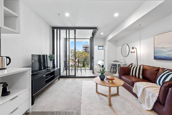 • Lounge / Dining ~ 2 Seater leather couch, 50’ Smart TV (all streaming apps Netflix etc…), Unlimited 50Mbps WiFi, Ducted Air-Con, Dining table + Chairs, Sliding door to Balcony