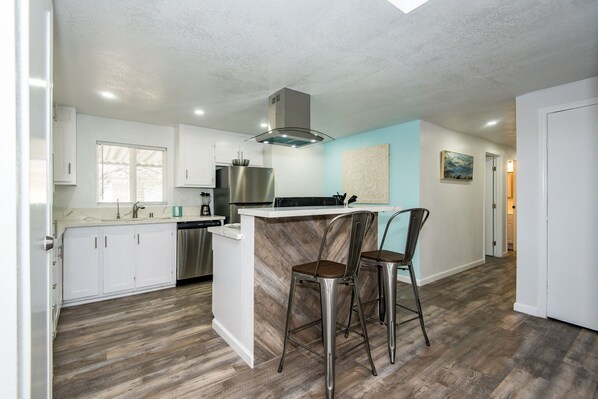 50 inch Smart TVs, work desk area, coffee, microwave, toaster, appliances, dining table for eight people, kitchen cooking basics, towels, linens, washer and dryer, Free WiFi, Prime Video.