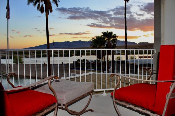 Stunning 3-bedroom, 2-bathroom, 2000 SF house on the Colorado River. Nestled on a serene river inlet, it's perfect for fishing, snorkeling, swimming, kayaking, and paddle boarding. The home boasts a Ruby Red kitchen and bathrooms with vibrant interior decor. Relax in the cozy living room featuring a large smart TV with access to Netflix and other services, plus every room includes a smart TV. Essentials like shampoo, conditioner, soap, and ample supplies are provided. The fully fenced, pet-friendly backyard has outdoor furniture, a table, and a new red BBQ grill. The spacious kitchen is fully stocked for all your cooking needs. Upstairs, the master bedroom features a king-size bed, a big walk-in closet, a private balcony, and an attached bath with a large tub and separate shower. The two main floor guest bedrooms, equipped with TVs, sleep additional guests comfortably with a queen and two twin beds. The property includes a large driveway for boat trailers, and a private dock, with a nearby boat ramp for easy water access. You'll appreciate the unobstructed views of the Colorado River and Arizona mountains, relax under the covered patio or soak in the 8-person jacuzzi. Enjoy peaceful mornings watching local wildlife, kayaking, fishing, or feeding ducks from the dock. Located near Veterans Memorial Park, the home is devoid of noise from the closed bar next door. Offering numerous activities and just a few miles from Laughlin Casinos, it's an ideal vacation spot for swimming, relaxing, and making lasting memories with family.