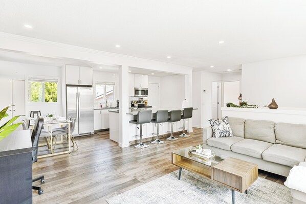 Step into this modern Calgary retreat, where comfort meets convenience. Unwind in the bright living room with a large flat-screen TV and plush seating or stay productive at the dedicated workspace.