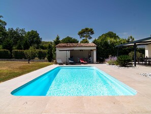 Escape to the French countryside at Villa D'Allongue, nestled in a private 2,500 m2 fenced area. This beautiful single-family vacation rental house boasts a well-kept garden and an angular swimming pool with an alarm system. Enjoy Internet WiFi, outdoor games like boules on site or relax by the fireplace while enjoying modern amenities.
