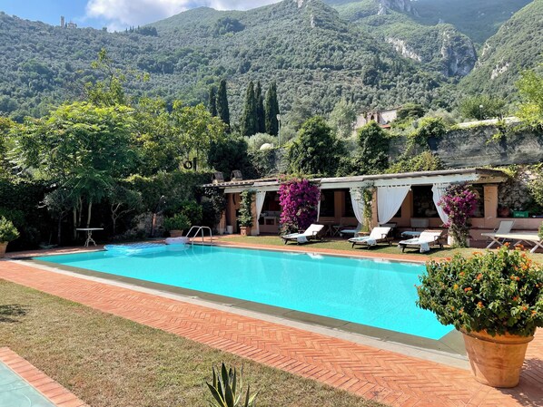 Outside a large courtyard surrounds the house, with garden and gazebo, an infinity pool with breathtaking views of the Apuan Alps, an equipped external kitchenette with a wood oven and barbeque grill under a Pompeian equipped with tables and chairs. The exteriors are fully illuminated, to experience magical summer evenings!