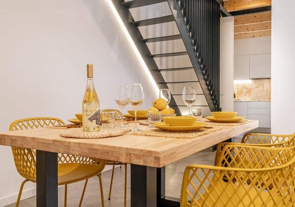 "Can Suis 9" is located in the picturesque village of Campanet. The elegant loft with open spaces consists of a living room, a well-equipped kitchen, 2 bedrooms and 1 bathroom, so it can accommodate 4 people. They include Wi-Fi, air conditioning, a washer/dryer and a Smart TV. There is also a high chair and a cot available upon request. In the morning, you can have breakfast on your private balcony, which has a spacious dining area, and enjoy the mountain views. The house stands out for its large shared outdoor area with another apartment "Can Suis 7" with a garden, covered and uncovered terraces, a large pool, barbecue and a full bathroom. Numerous sun loungers and umbrellas invite you to spend hours in the sun by the pool.