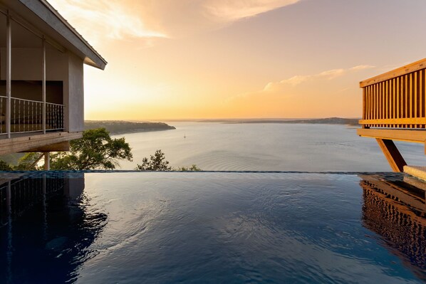 🌳 Outdoor Features • Private lakefront setting — ideal for picnics, boating: boat ramps currently closed, or peaceful lakeside relaxation with infinity pool. • Resort-style outdoor living with poolside loungers, a soothing hot tub, and rejuvenating sauna experiences • Expansive views of the lake, rolling Hill Country, and nearby dam from multiple vantage points • Two-story deck designed for everything from sunrise coffee to sunset dining and entertaining • Covered lower deck and shaded porch spaces for comfortable outdoor gatherings year-round ⛱️