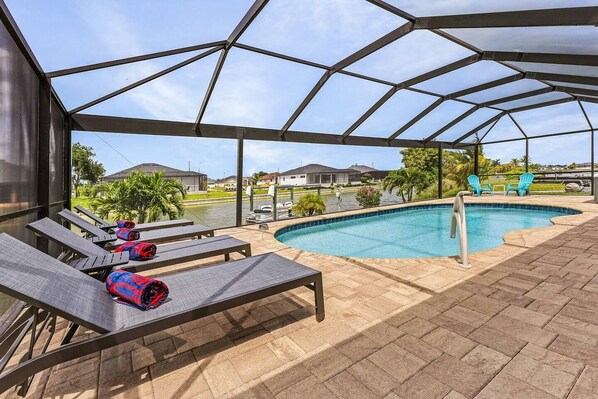 Escape to Villa Sun Daze, your ultimate waterfront paradise retreat. Unwind in the spacious living area, or fire up the outdoor BBQ grill for an alfresco dining experience. Enjoy a refreshing dip in the heated pool and hot tub, or lounge under the warm Florida sun with an outdoor TV nearby.
