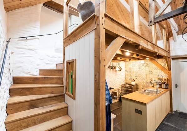 The entire building is a renovated corn store, with original features throughout, it is light and airy with the feeling of space. The main living space is an open plan living area with gorgeous bespoke birch ply kitchen and a mezzanine reading space above. Through to the back of the building is the shower room & bedroom.