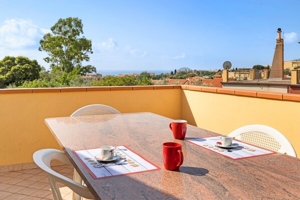 Sia dal soggiorno che dal terrazzo si gode una vista meravigliosa, pranzare con quel panorama ha reso la vacanza ancora più bella.