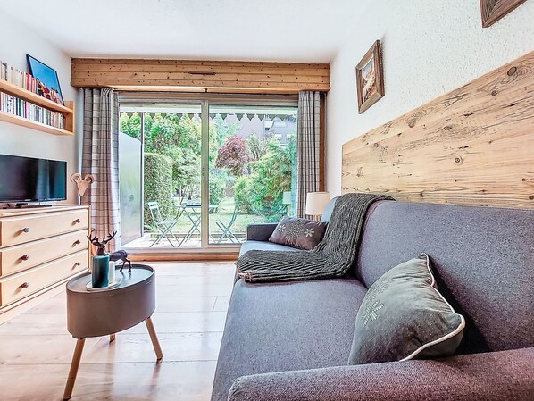 1-room studio 21 m2, on the ground floor, south facing position. Living/dining room with 1 double sofabed (160 cm, length 190 cm), TV. Exit to the terrace, to the patio. Entrance hall with 1 wall-trunk bed (80 cm, length 190 cm). Kitchenette (4 hot plates, oven, kettle, electric coffee machine). Bath/WC. Electric heating. Terrace, patio. Terrace furniture. Beautiful view of the mountains. Facilities: washing machine. Internet (WiFi, extra). Please note: non-smokers only, no parking. TV only FR. Smoke alarm. 74056 000385 ZT