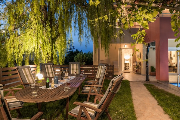The well-maintained lawn garden with several plants and trees, the pool with sunbeds (heated at extra cost), the comfortable long dining table under the shade of a weeping willow, and the BBQ facilities (wood oven, charcoal BBQ and external sink) will make your outdoor living a unique experience, you will never forget!